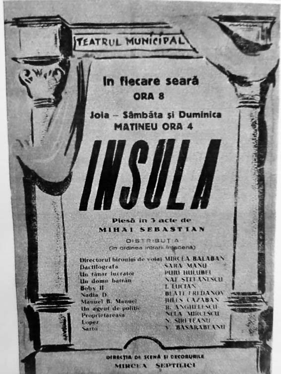 După cum se ştie, Mihail Sebastian nu a apucat să scrie decât primele două acte ale piesei Insula. Actul III a fost scris ulterior de prietenul său, actorul Mircea Şeptilici, care a şi montat piesa în anul 1947, la Teatrul Municipal din Bucureşti. Întrucât Mircea Şeptilici a plecat în Canada, nu se cunoaşte exact ce s-a întâmplat cu textul respectiv. Ulterior, Ion Caramitru i-a cerut lui Bedros Horasangian să scrie Actul III, având intenţia să monteze din nou piesa, în regia Ancăi Bradu.