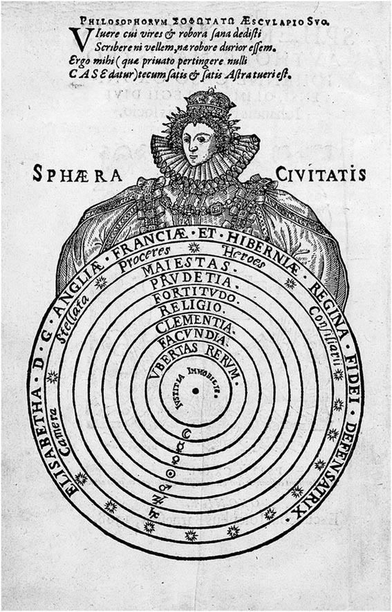 Simbolismul de sinteză al reginei Elisabeta I este ingenios şi strategic conotat în diagrama numită Sphaera civitatis (realizată în 1588 de John Case), în care regina este reprezentată ca fiind chiar universul, respectiv pământul înconjurat de lună, soare şi planete, după un model ptolemeic clasic[6]. Această diagramă conotată la nivel maximal (spiritual, monarhic, mistic, mitologic) a stimulat iconic proiecţia asupra reginei ca hiperbolă a tuturor virtuţilor şi a catalizat ulterior un alt simbol care i-a fost arondat strategic la senectute, acela al Păsării Phoenix[7]. Edmund Spenser o plasează pe regină în centrul poemului său The Faerie Queene, respectiv în centrul lumii sacre şi totodată profane.