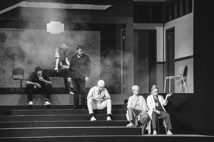 Decorul Irinei Moscu este cu totul diferit de cel pe care l-a creat pentru spectacolul cu trupa maghiară de la Timişoara, care, deşi regizat de Andrei Şerban, nu are nimic în comun, ai crede că este o cu totul altă echipă de creaţie. Dacă la Timişoara decorul era pe turnantă, în mişcare continuă, la „Nottara“ este static, sobru, cu liniile foarte bine trasate. Verdele-gălbui al panourilor (culoarea se regăseşte şi în uniformele doctorilor) se combină cu griul negricios al pardoselii şi al scărilor şi cu griul alburiu al scaunelor. Această austeritate este spartă, din timp în timp, de adevărate tablouri vegetale, care apar în fundal.